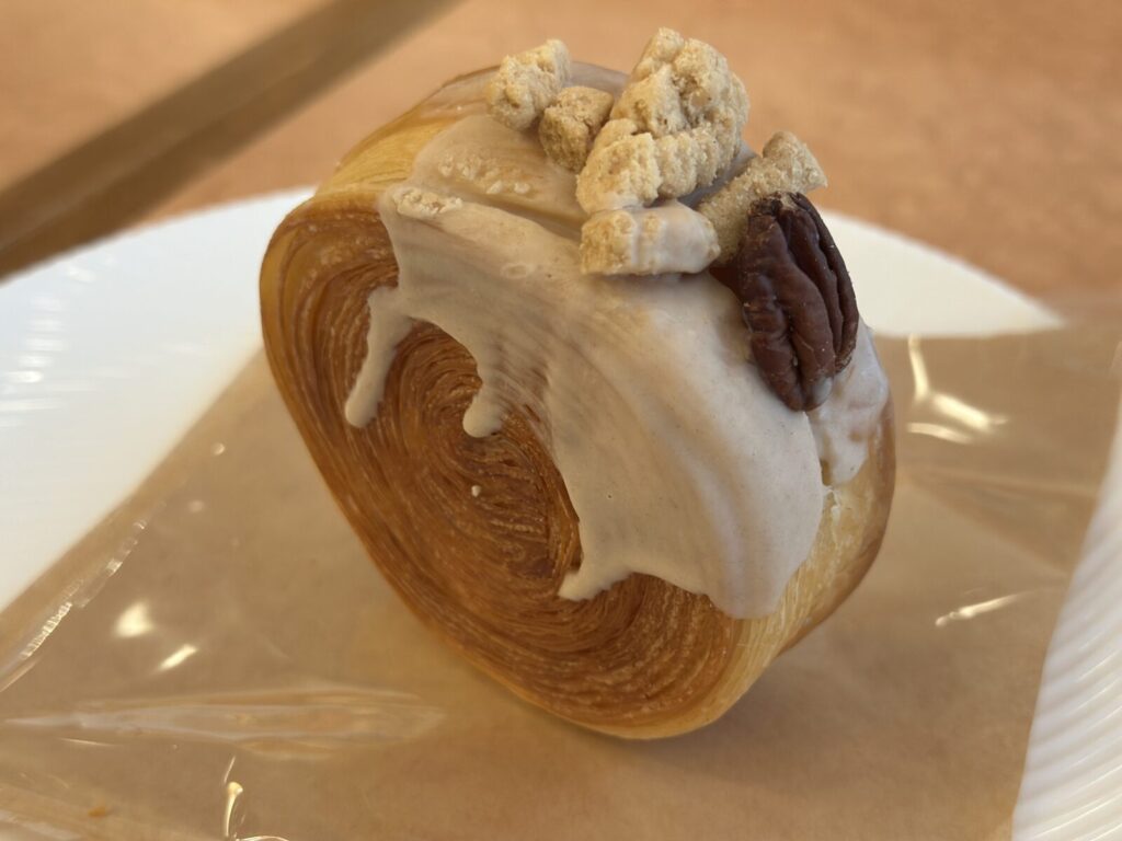 ほんのり甘酸っぱいリンゴとシナモンの香り豊かなジャムを巻き込んだクロワッサンロール。そこにナッツの食感が加わり、風味のバランスが見事でした。シナモン好きの方にはたまらない、上品で深みのある味わいです。