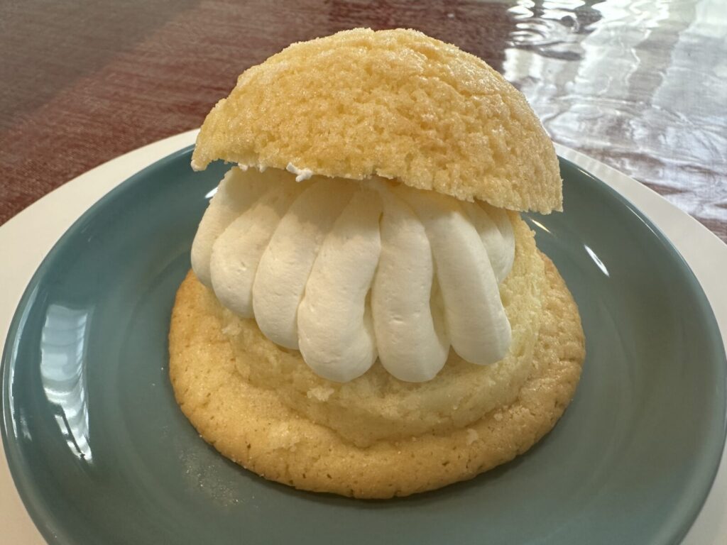 こちらは夏の季節にぴったりのひんやりスイーツパン。外側はサクサクとしたメロンパンらしい食感で、中にはふんわり柔らかなクリームがたっぷり。ひんやり冷やされていて、甘さも程よく軽やかなので、暑い日に特におすすめです。購入時には保冷剤もつけてもらえる心遣いが嬉しく、持ち帰り時間を気にせず楽しめます。