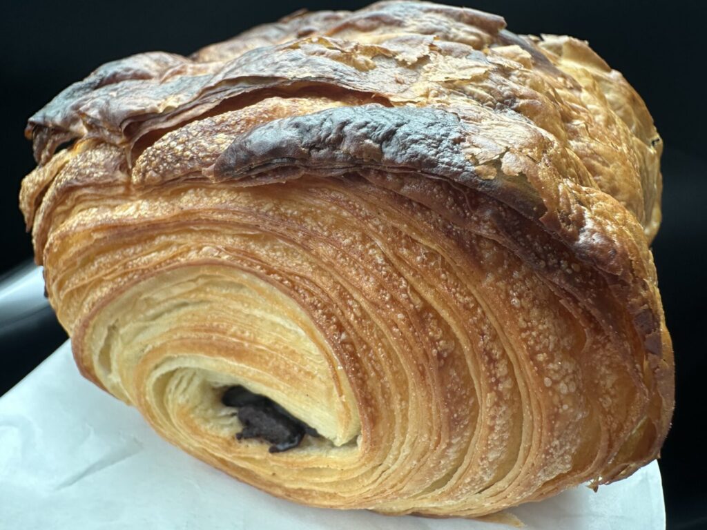まずいただいたのは「パン・オ・ショコラ」。層が幾重にも重なったデニッシュ生地の中にチョコレートが包み込まれていて、一口かじるとサクッとした食感と濃厚なショコラの風味が広がります。デニッシュの層がとても綺麗に焼き上がっていて、軽やかな口当たり。朝食やおやつにぴったりの一品でした。
