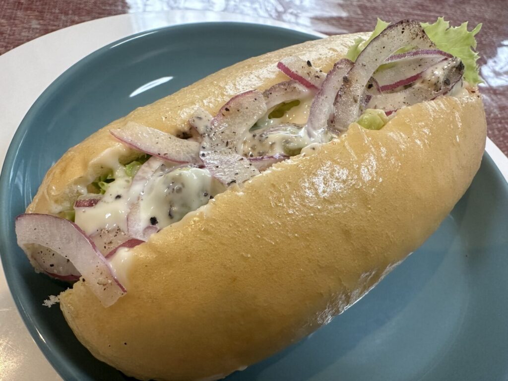 ふわっと軽いコッペパンに、ぷりっとしたエビ、シャキシャキのレタス、まろやかなアボカド、そしてオニオンがバランス良くサンドされています。クリーミーさとさっぱり感の両方を楽しめる一品で、健康志向の方にもおすすめしたい組み合わせでした。