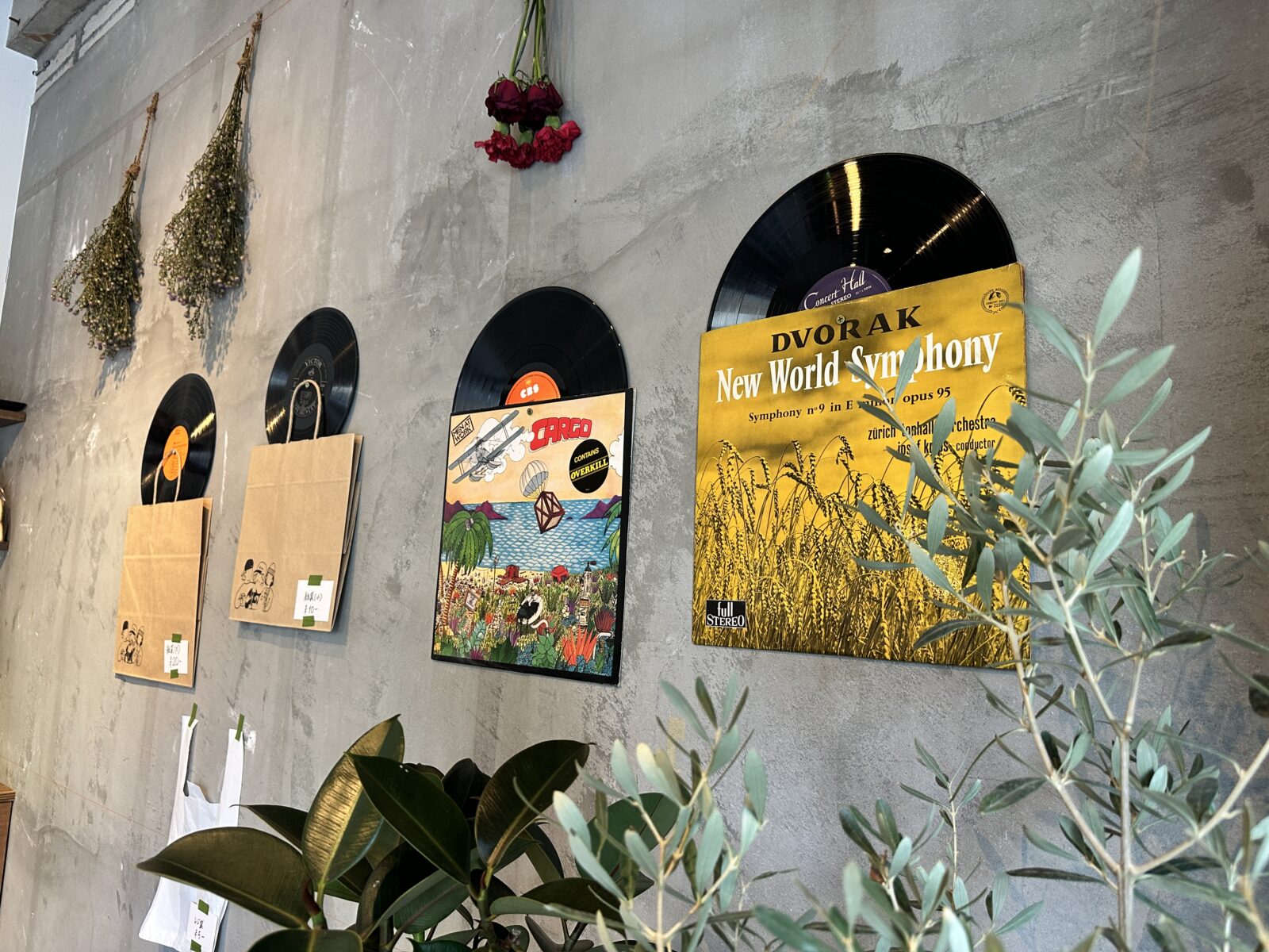 店内はコンクリート調の壁にドライフラワーやレコードジャケットが飾られており、スタイリッシュで落ち着いた空間。おしゃれなのにどこか温かみがあり、つい長居したくなる居心地の良さがあります。