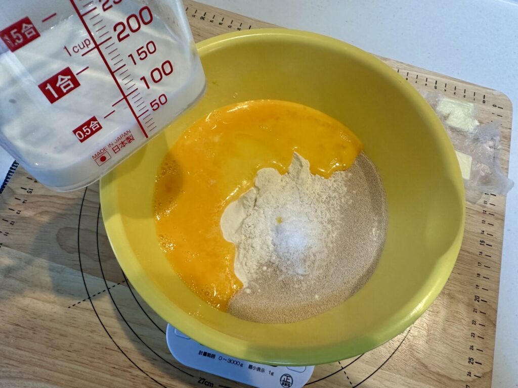 まずは生地作りからスタート。今回は水ではなく牛乳を使用したレシピです。牛乳を使うことで、仕上がりがよりリッチで柔らかく、風味も豊かになります。