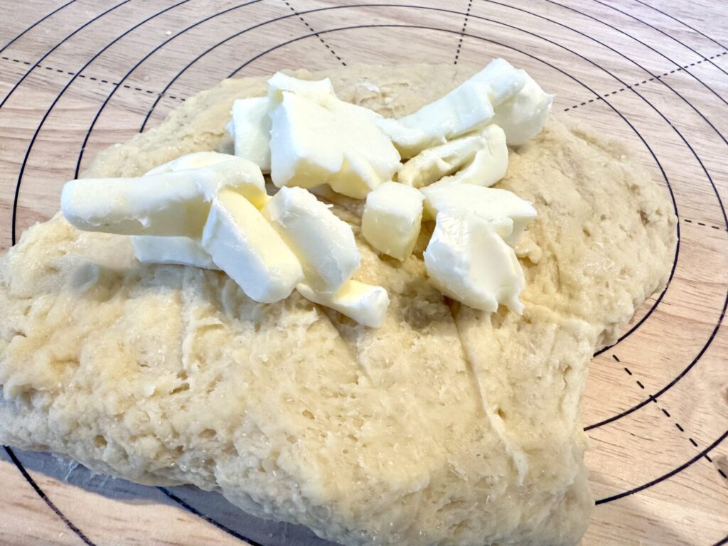 材料を混ぜ合わせ、途中でバターを加えてこねていきます。強力粉を使用しているため比較的こねやすく、まとまりやすい印象でした。生地がつるんとまとまり、なめらかな状態になったら準備完了です。