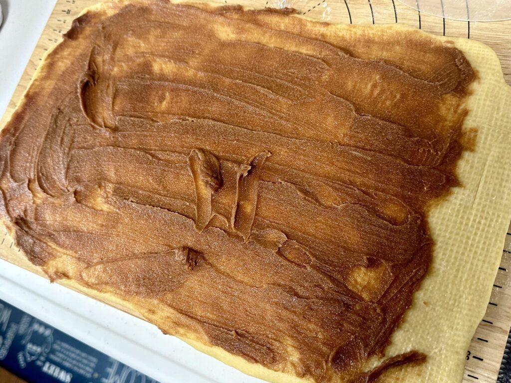 発酵が完了したら、いよいよ成形です。長方形に伸ばした生地の上に、シナモンとバターを混ぜ合わせた「シナモンバター」をたっぷり塗ります。