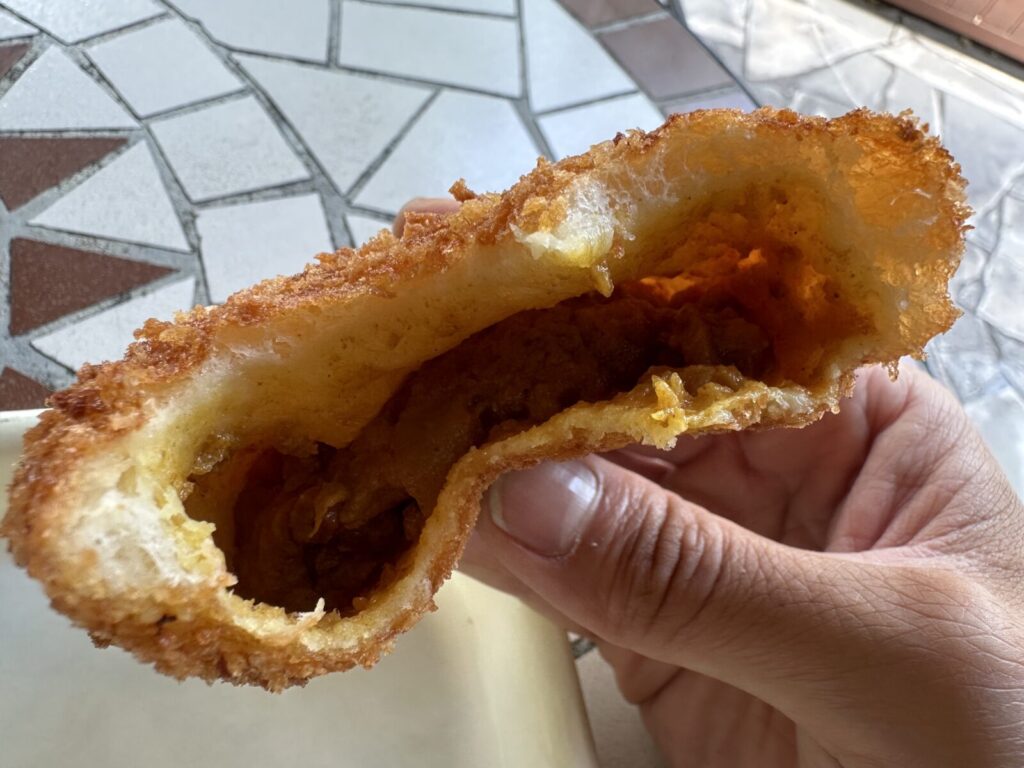 揚げたてのパン生地は外側がサクッと香ばしく、中はもっちりとした食感。その中にぎっしりと詰まっているカレーは、牛肉と豚肉がたっぷり使われていて、ひと口ごとに旨味が広がります。スパイスの風味はほどよく効いていて辛すぎず、子どもから大人まで楽しめる味わい。まさに「暖家といえばカレーパン!」といえる存在です。