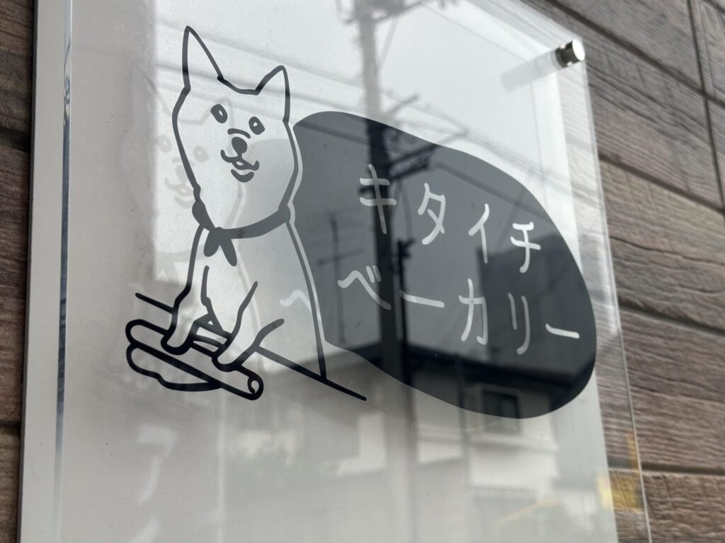 お店の外観はシンプルで温かみがあり、白い壁に描かれた柴犬のイラストがひときわ目を引きます。この柴犬が『キタイチベーカリー』さんのシンボルで、看板にもデザインされており、一度見たら忘れられない親しみやすさがあります。