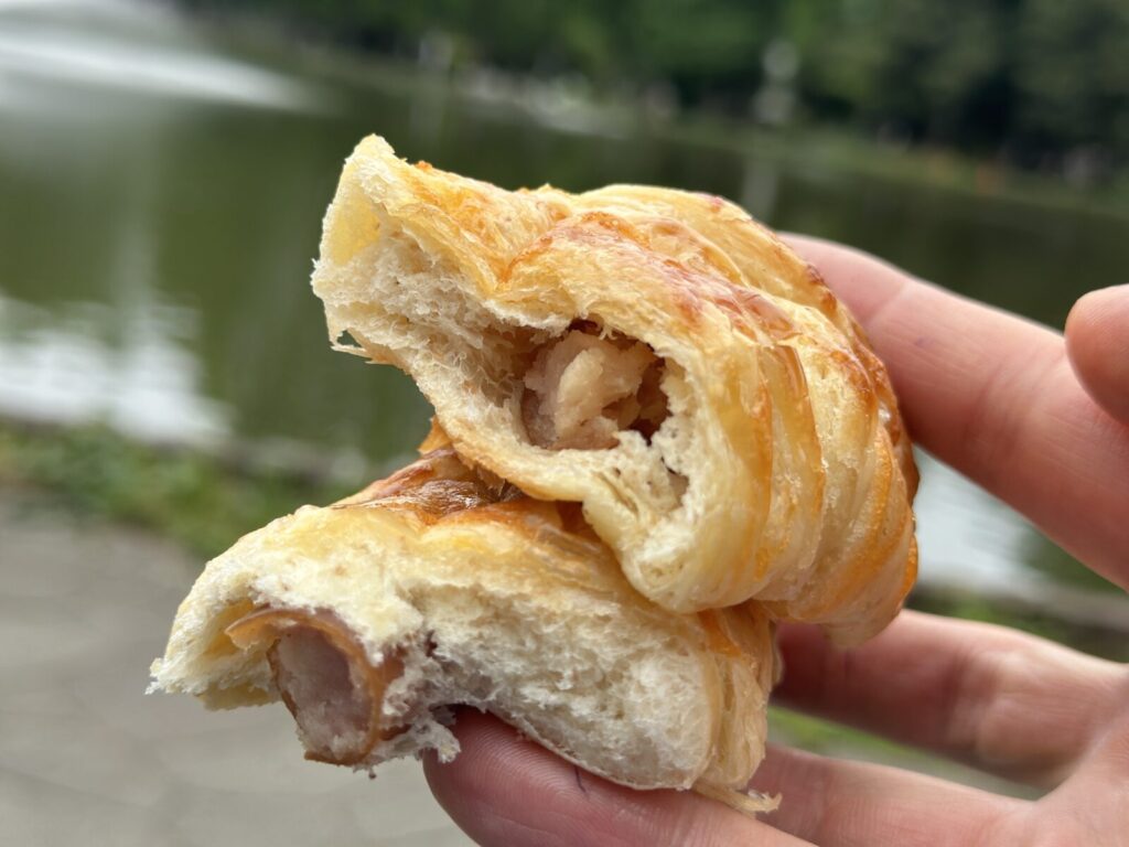 パリッとした表面が美しいデニッシュ生地をひと口かじると、まず感じるのは外側の香ばしいサクッと感。中はふんわりと柔らかく、空気をたっぷり含んだ軽やかな食感が印象的です。