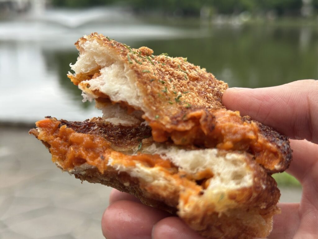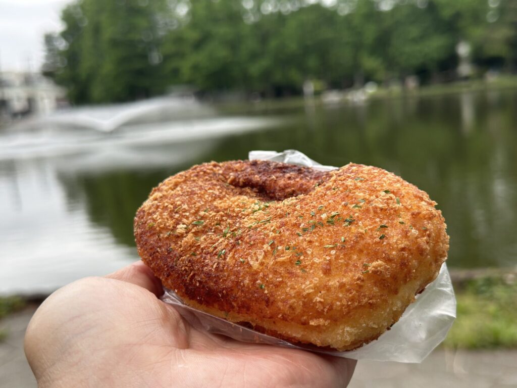 ひと口かじった瞬間、まず感じるのはカリッと香ばしい衣の食感。パンの表面はこんがりと揚がっていて、ほんのりガーリックのような香ばしさも漂います。中の生地はふわっと柔らか。