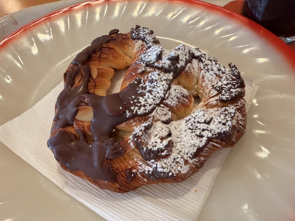 そこにたっぷりとかかったチョコレートとアーモンドスライスが加わり、食感と風味の両方で楽しませてくれます。さらに粉糖が全体をやさしくまとめていて、甘さに角がなく、最後までバランスよく味わえる仕上がりになっています。一口ごとに違った表情を見せてくれるのも魅力的です。