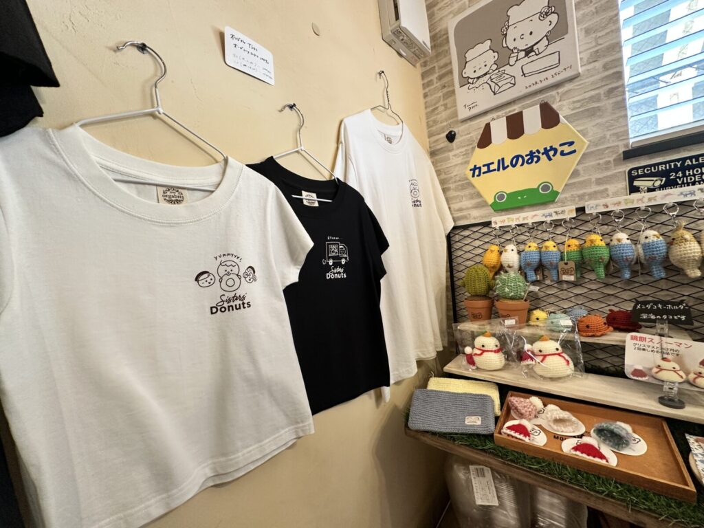 店内には手書きのメニュー、かわいいロゴ、手作り雑貨、オリジナルのTシャツなど、