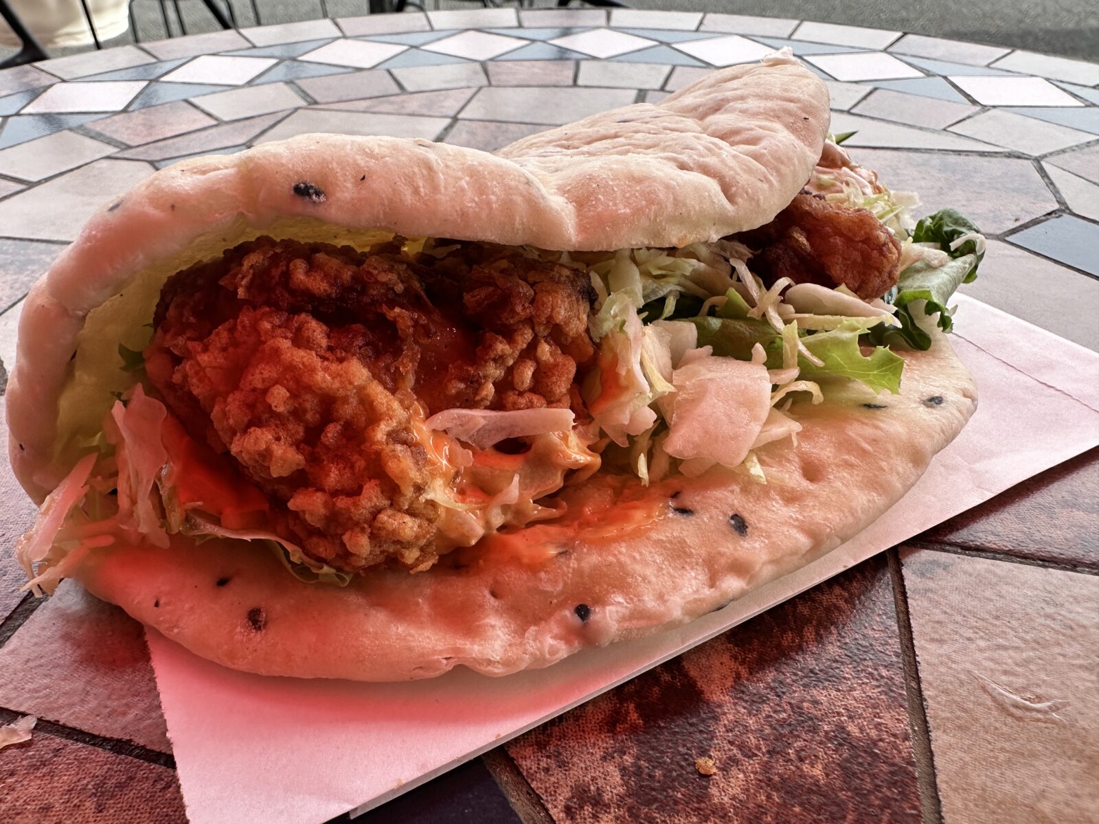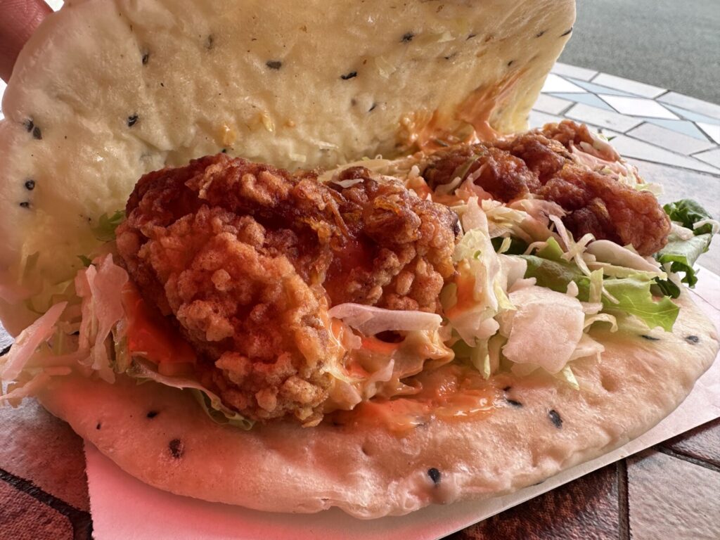 自家製のコチュジャンソースがピリッと効いた、少しアジアンテイストな調理パンです。ふんわりとしたナンのような柔らかい生地に、唐揚げが2つ、そしてシャキシャキ野菜がたっぷり。ボリュームもありながら、味のバランスが絶妙。